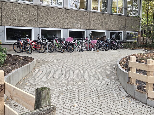 Die Gemeinde hat schneller reagiert als geglaubt. Es sollte hier kein Provisorium geschaffen werden, sondern eine vernünftige Lösung. So rollten vor den Herbstferien 2025 die Bagger an und innerhalb von kurzer Zeit entstanden Fahrradständer auf einer gepflasterten Fläche in der Nähe des Haupteinganges unserer Schule. Richtig klasse!