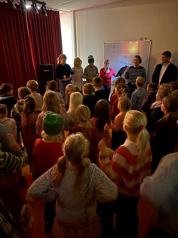 "Die alte Moorhexe" mit der 3a und ein "Gruselsong", gesungen von der 4b machten den Anfang unseres traditionellen Singevents. Damit verabschiedeten wir musikalisch den Herbst und stiegen mit den Weihnachtsglocken, die da so herrlich läuten, gesanglich in den Advent ein. Die Delfinklasse 2b traute sich vor der ganzen Schule zwei schöne Gedichte vorzutragen und auch die Löwenklasse 2a waren mutige Sänger/innen. Dass wir am Ende alle "froh und munter" waren, verstand sich von selbst. Zumal der Nikolaus für jede Klasse noch eine kleine süße Überraschung überreichen konnte.